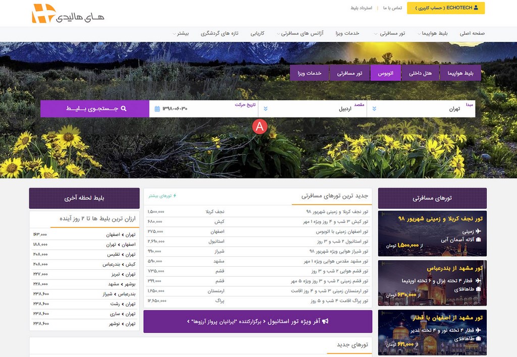 A برای خرید آنلاین بلیط اتوبوس در ابتدا کافیست موارد زیر را جستجو نمایید. مبدا - مقصد - تاریخ خود را وارد کنید و سپس روی دکمه جستجوی بلیط کلیک کنید.