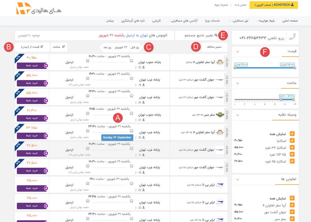 F فیلتر ها به شما امکان می دهد نتایج جستجو را کم یا زیاد کنید که بر اساس قیمت بلیط ساعت سفر وسیله نقلیه و تعاونی ارائه دهنده بلیط می باشد.