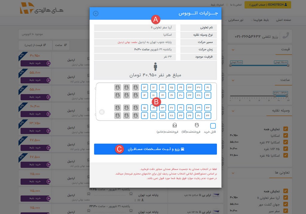 B نمایی از صندلی های اتوبوس را به شما نمایش می دهد. برای انتخاب صندلی دلخواه خود روی شماره آن کلیک کنید تا رنگ آن تغییر کنید. در صورت کلیک دوباره روی شماره صندلی انتخاب آن حذف میشود. به عکس خانم یا آقا در صندلی ها دقت کنید این صندلی ها قبلا رزرو شده هستند.