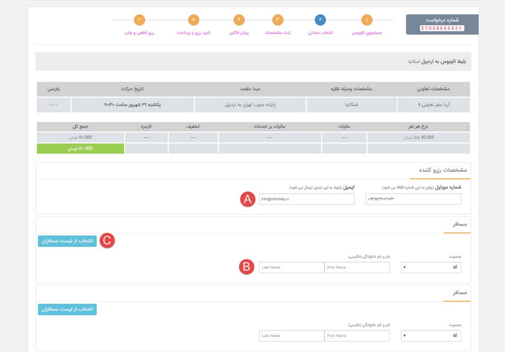 B مشخصات مسافران را اینجا وارد کنید. برای هر مسافر اطلاعات را وارد نمایید.