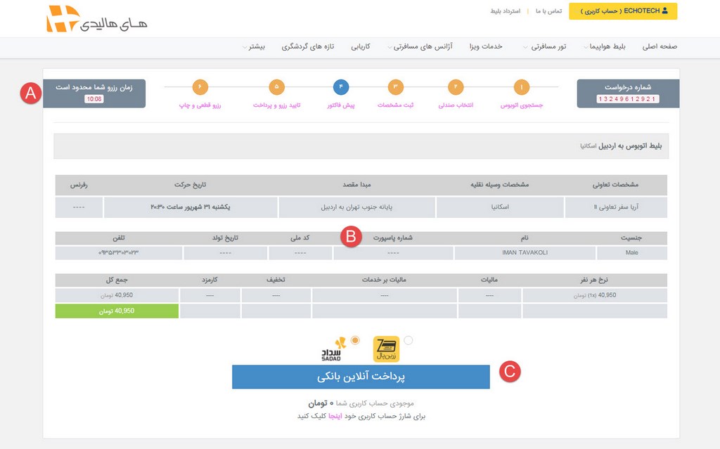 A مدت زمانی که فرصت دارید تا رزرو خود را نهایی کنید در اینجا نمایش داده شده است. در صورت گذشتن از این زمان باید مراحل رزرو بلیط اتوبوس را از ابتدا انجام دهید.