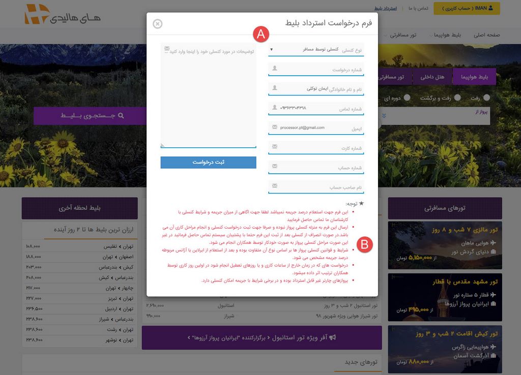 A فرم مربوط به کنسلی را به دقت وارد کنید، خصوصا شماره کارت و شماره حساب، زیرا مبلغ کنسلی بعد از تایید به این حساب واریز می شود. شماره تماسی را وارد کنید که پاسخگو باشید.