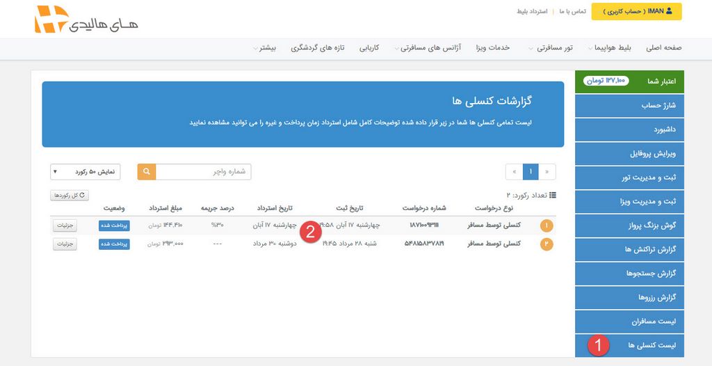 B برای آگاهی از وضعیت کنسلی یا توضیحاتی مانند شماره پیگیری بانک یا نواقص در فرم کنسلی شما می توانید بر روی جزئیات کلیک کنید.